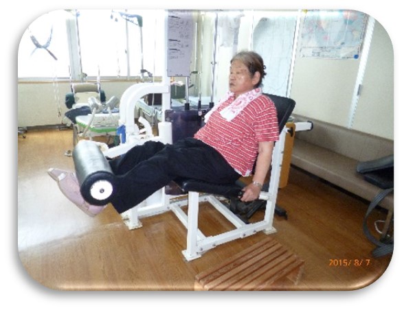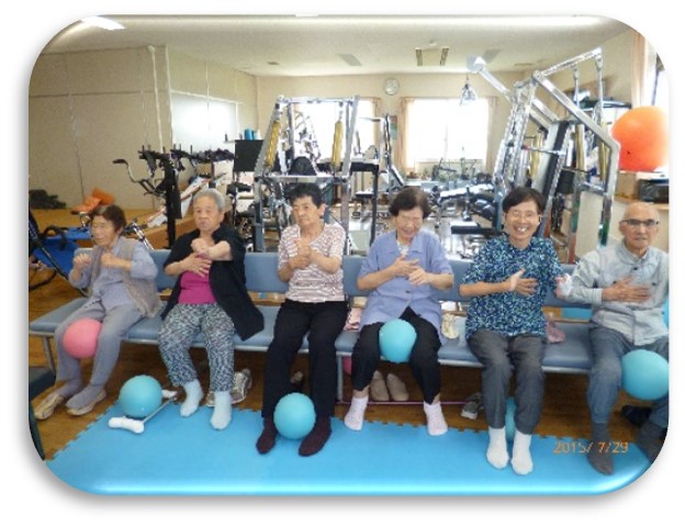 機能訓練指導員が常勤しており、ご利用者様の希望や体調に合わせて筋力トレーニングや関節可動域訓練、歩行訓練などを行なっています。合わせて、ボール体操や昼食前の体操など、運動して頂く機会を多数ご用意し、楽しみながら運動して頂けるようにしております。
